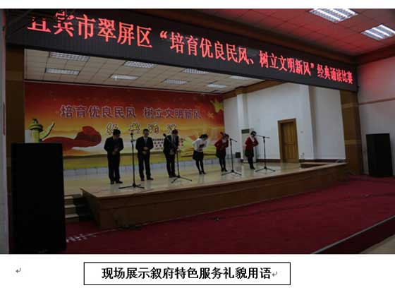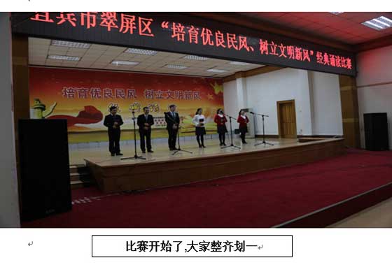 为了积极培育和践行社会主义核心价值观,倡导文明新风、形成优良民风,不断深化省级文明城市创建,由区文明办、团区委、区文广局主办的宜宾市翠屏区2015年“培育优良民风 树立文明新风”经典诵读比赛于2015年12月29日在宜宾市翠屏区政协礼堂拉开帷幕。中共宜宾市翠屏区委副书记朱莉、区委常委、宣传部长何春林、区人民政府副区长、公安分局局长杨国庆、人大常委会副主任肖慧、区政协副主席甘筱华等领导出席了本次活动。经翠屏区商务局初赛选拔,我公司有幸代表区商贸系统参加此次经典诵读26支队伍的角逐。我公司选手围绕比赛主题,以“文明风、叙府情”为题,慷慨激昂地诠释了叙府独有的文明风尚,并在此次比赛中荣获了三等奖的好成绩